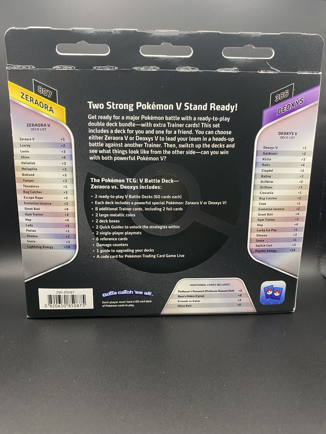 1. Das Pokémon TCG: V Battle Deck – Zeraora vs. Deoxys enthält 2 spielfertige V-Battle-Decks (je 60 Karten) und jedes Deck enthält ein mächtiges spezielles Pokémon.